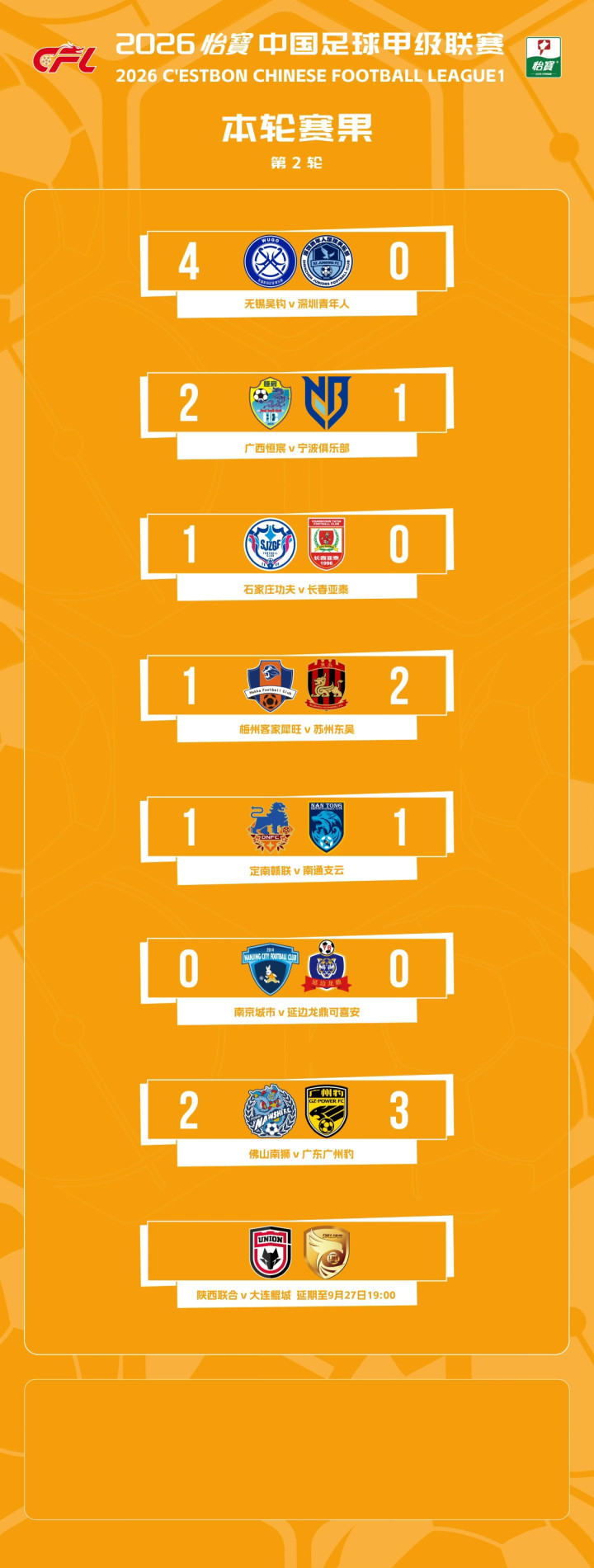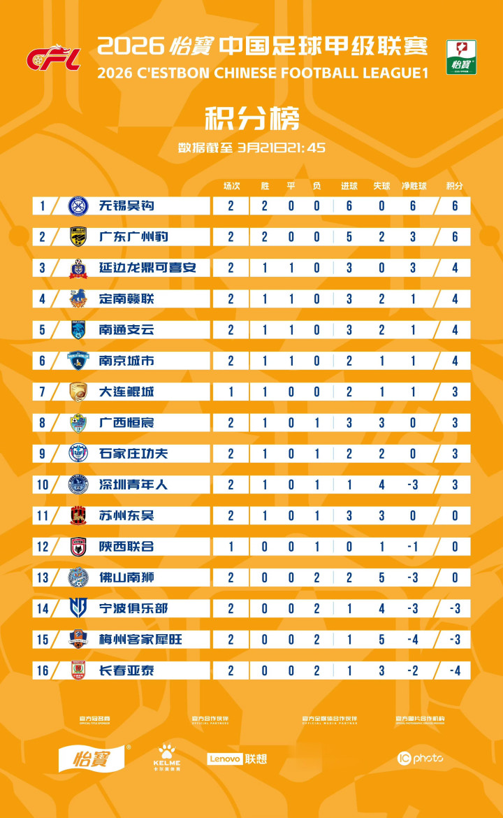 中甲第2轮全赛果及积分榜