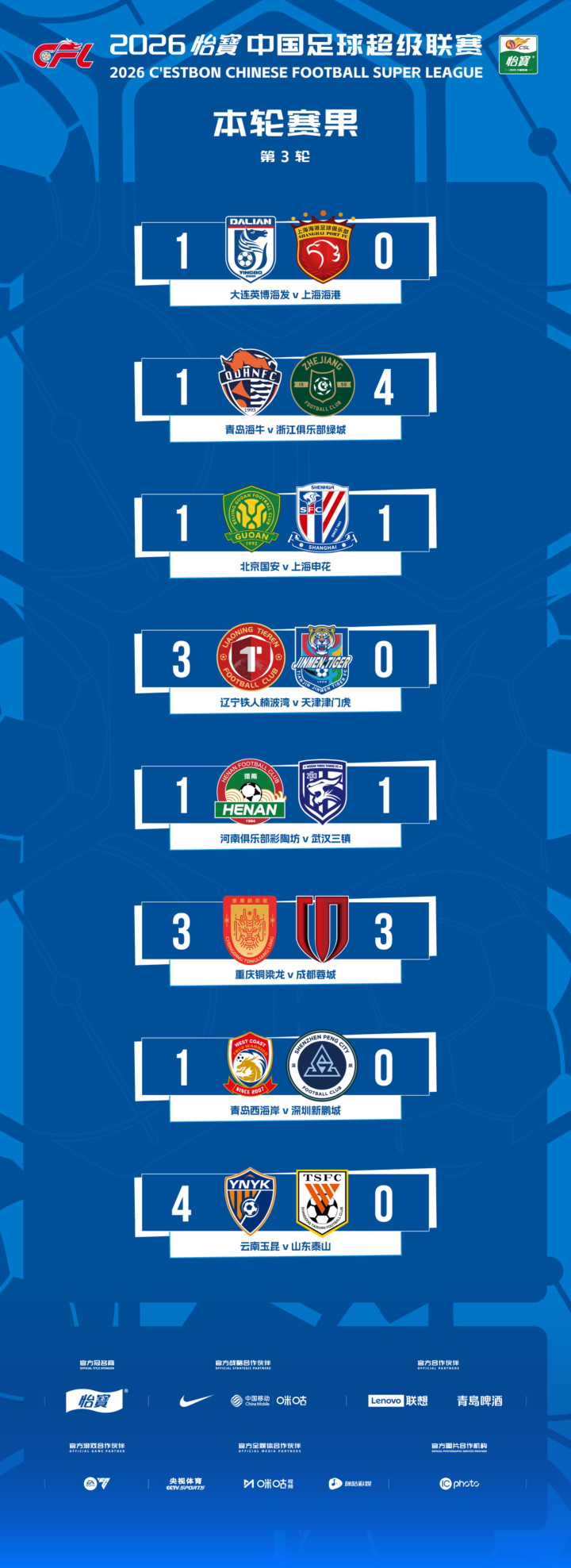 中超第3轮全赛果及积分榜