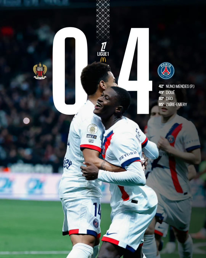 北京时间3月22日04:05,法甲联赛第27轮,尼斯主场迎战巴黎圣日耳曼。上半场努诺-门德斯罚入点球,下半场杜埃破门,恩达伊希米耶染红,德罗-费尔南德斯建功,扎伊尔-埃梅里锁定胜局。最终比分定格为尼斯0-4巴黎圣日耳曼。