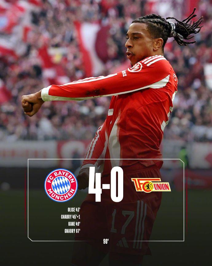 北京时间3月21日22:30,德甲联赛第27轮,拜仁在主场慕尼黑安联球场迎战柏林联合。上半场伦纳特·卡尔中柱,奥利塞破门,格纳布里再下一城,拜仁暂2-0柏林联合;易边再战,凯恩建功,格纳布里再进一球,最终拜仁4-0柏林联合。