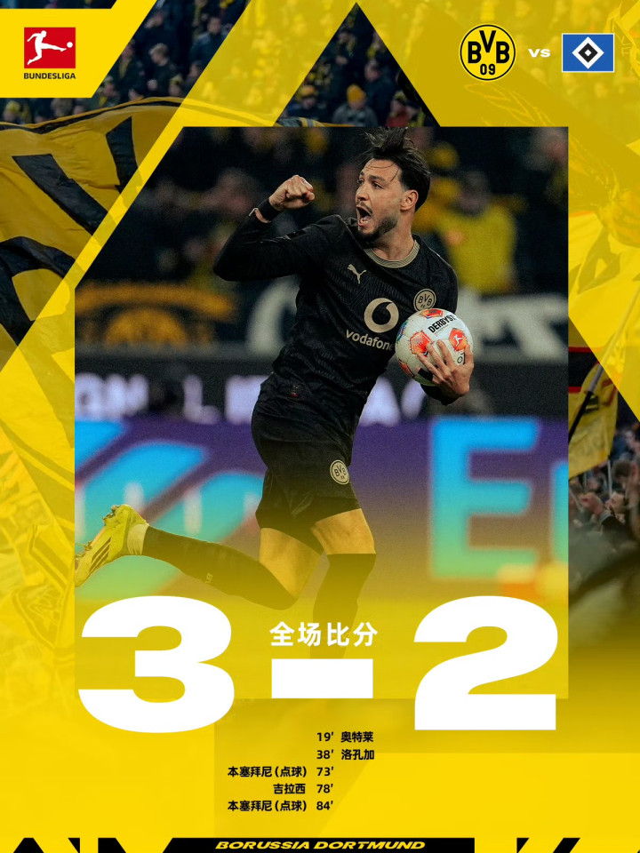 北京时间3月22日01:30,德甲联赛第27轮,多特蒙德主场对阵汉堡。上半场斯文松被抢断,迈克尔布伦西斯助攻奥特莱破门,之后恩梅加被抢断,维埃拉助攻洛孔加破门,随后拜尔造点,恩梅加踢偏。下半场拜尔再次造点,本塞拜尼罚进扳回一球,之后吉拉西两连击破门扳平比分,随后穆海姆手球送点,本塞拜尼点射双响反超。最终多特3-2逆转汉堡。
